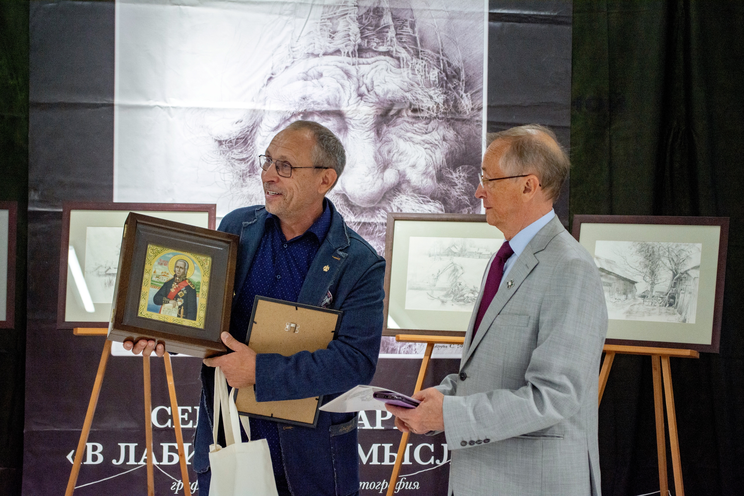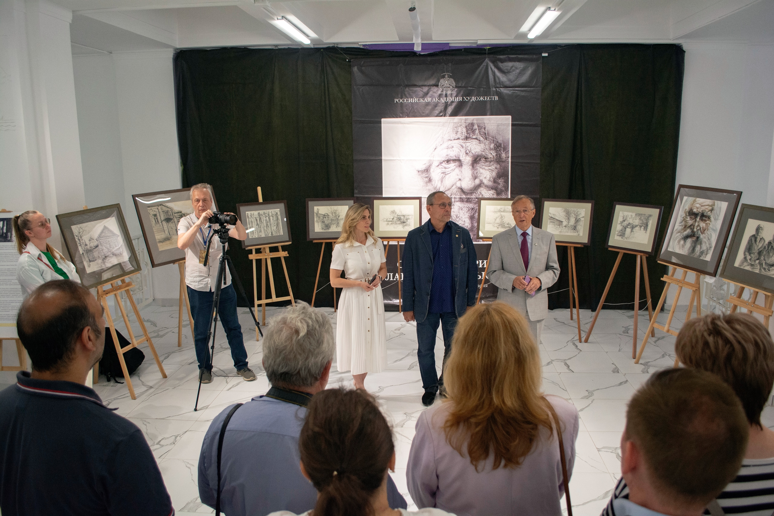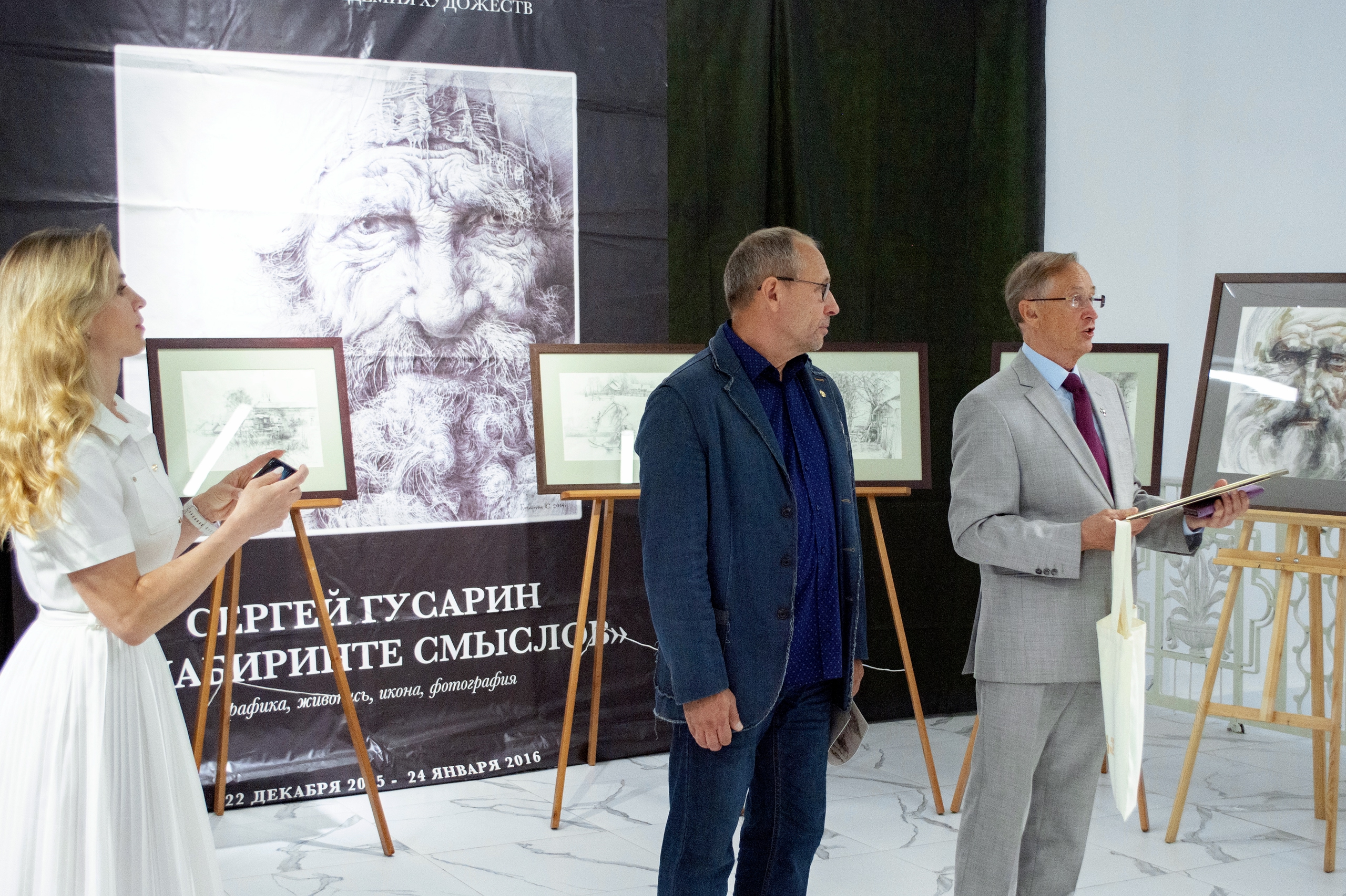 Открыли выставку Президент Международного Форума «Золотой Витязь», Народный артист России Николай Бурляев, сам автор — Сергей Гусарин, а также председатель Союза художников в Рыбинске Татьяна Стасюк.