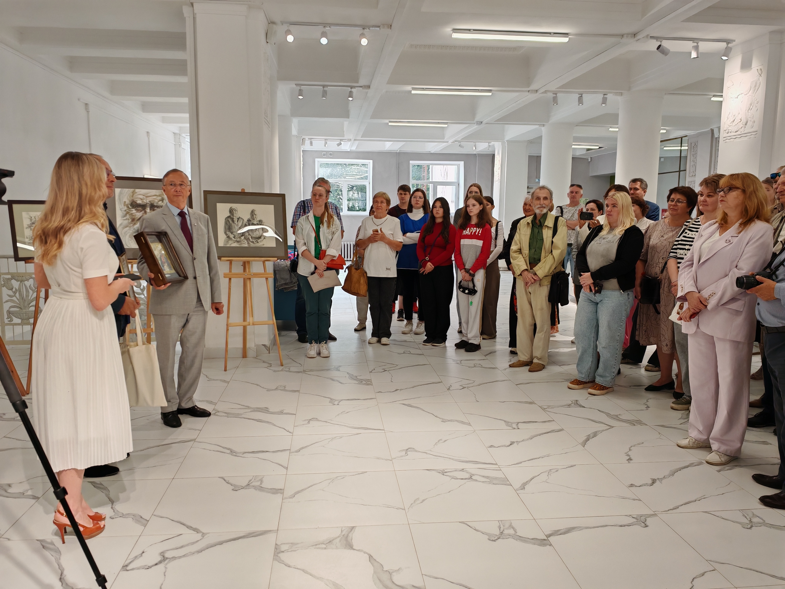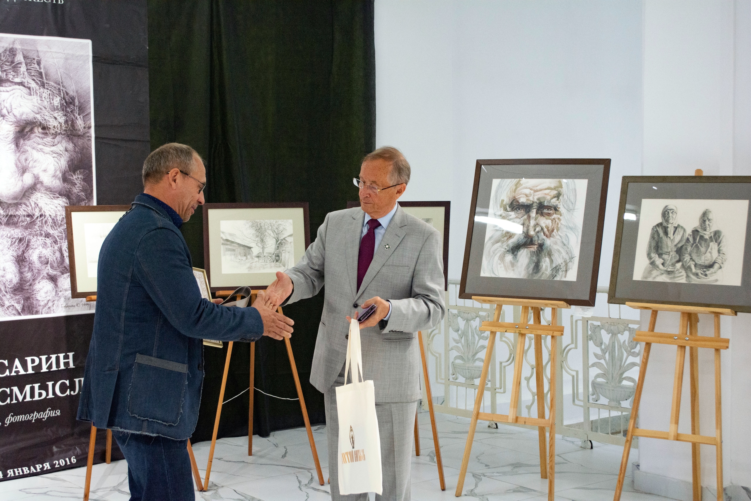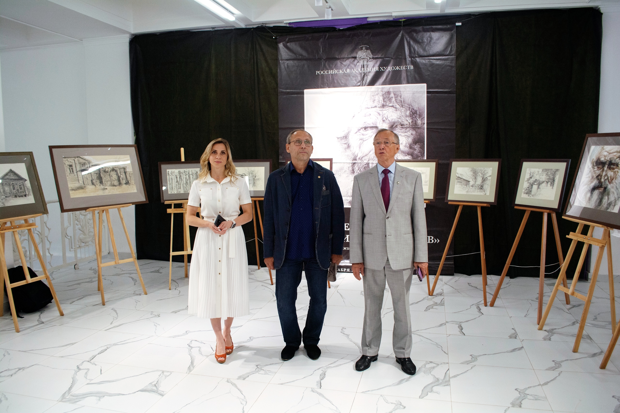 Открыли выставку Президент Международного Форума «Золотой Витязь», Народный артист России Николай Бурляев, сам автор — Сергей Гусарин, а также председатель Союза художников в Рыбинске Татьяна Стасюк.